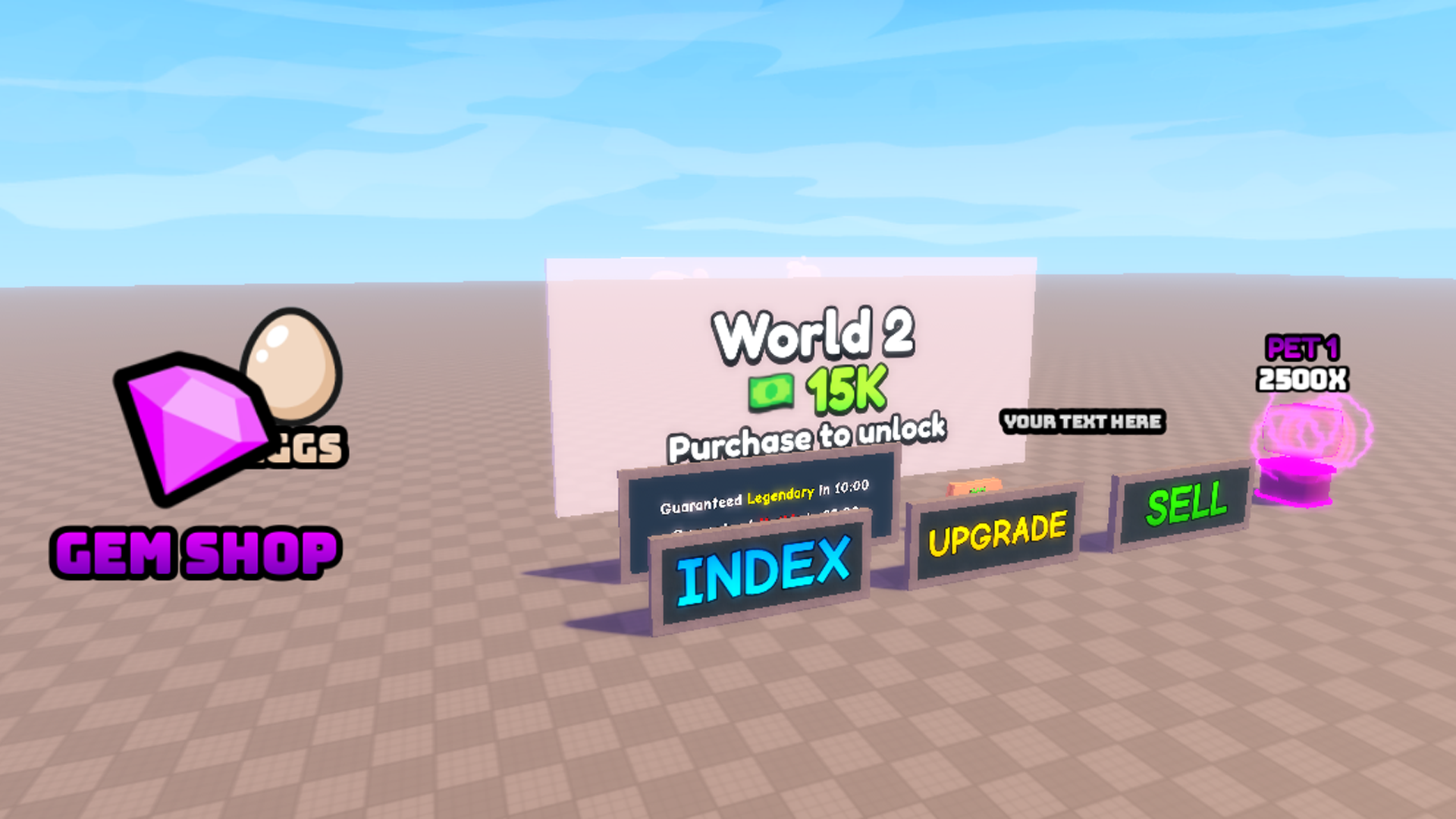 Inspired by bright, eye-catching simulator interfaces, this pack gives you everything you need to build engaging shop areas, upgrade stations, world unlock gates, and pet displays.
